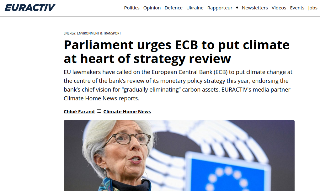 “After this vote, the ECB can now confidently start its strategic review, knowing there is agreement in principle that the bank should play a role in the EU’s climate strategy,” Stanislas Jourdan said.
